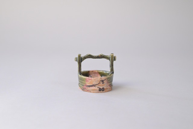 小さく、しかし記憶に残る豆向付。 須賀保中さんらしい、意匠性の高い持ち手が架けられた一点です。 低く締まった胴に、橋のように渡された把手。 造形としての面白さと、焼き物としての確かさが同居しています。 緑釉の奥に土味がのぞき、ところどころに火色があらわれる。 派手さはないものの、使い込むことで静かに景色が深まっていく、 そんな予感を持った豆向付です。 酒肴や珍味、小さな菓子に。 また、向付としてだけでなく、 香や小物を納める器としても愉しんでいただけます。 掌に収まる小さな器ですが、 棚に置いたときの存在感も含めて、 須賀保中さんの仕事を感じられる一作です。 径 5.1センチ 高さ 5.2センチ #須賀保中 #豆向付 #向付 #酒器 #小さな器 #一点もの #陶器 #うつわのある暮らし #器好き #工芸 #酒論松むろ