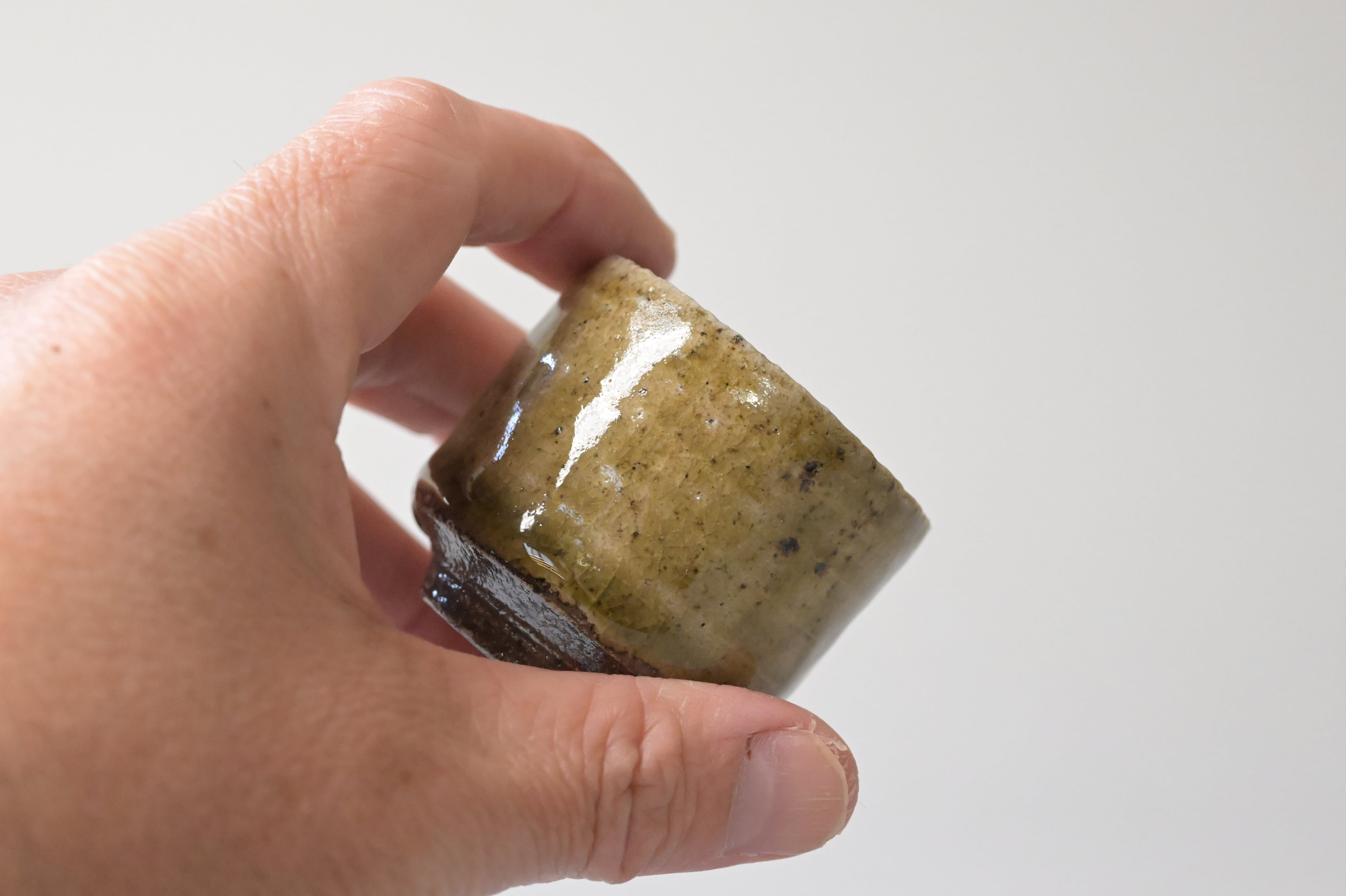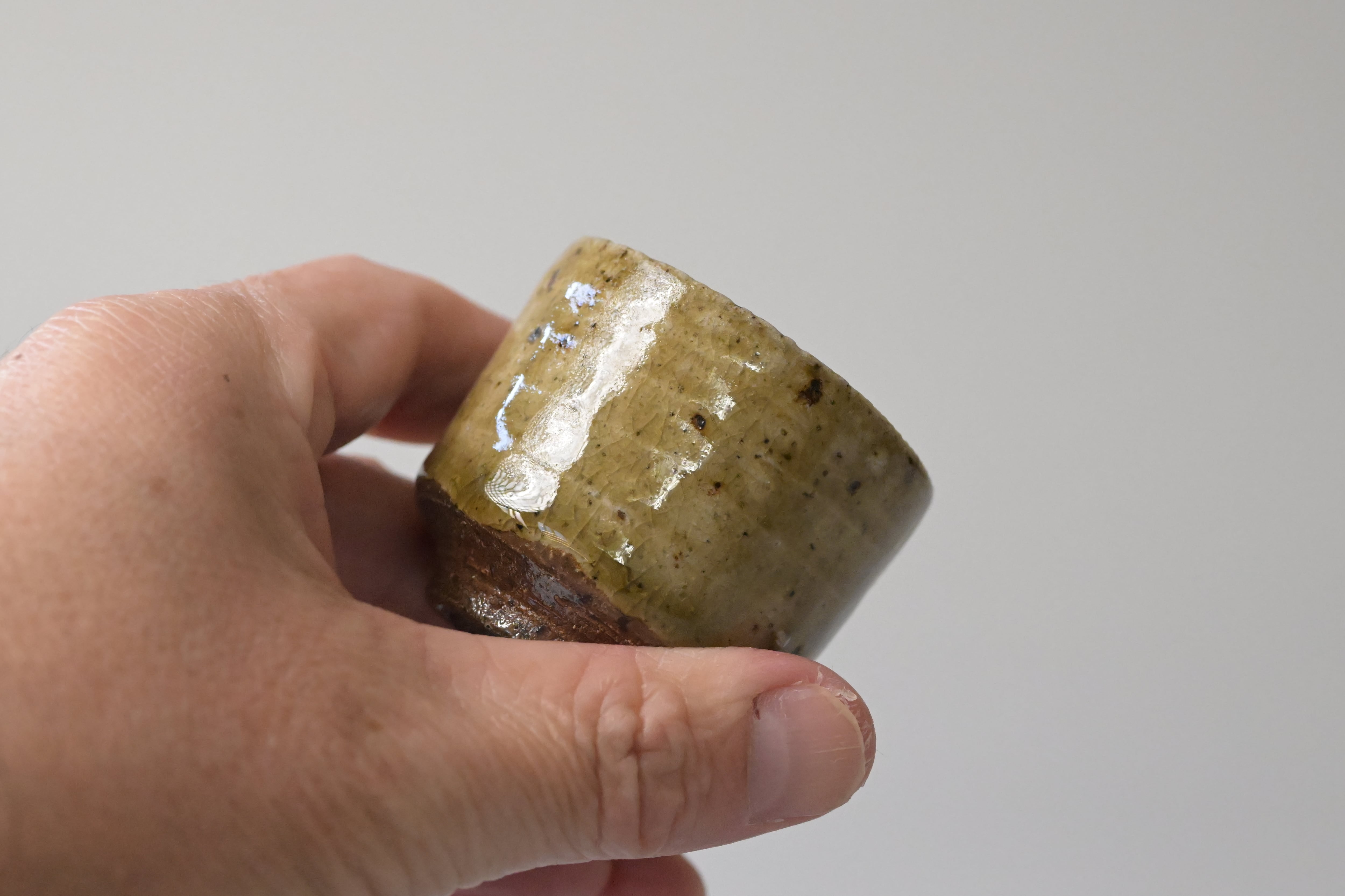 土味の力強さと、柔らかな灰釉の景色が美しく調和した、戸川雅尊さんのぐい呑です。