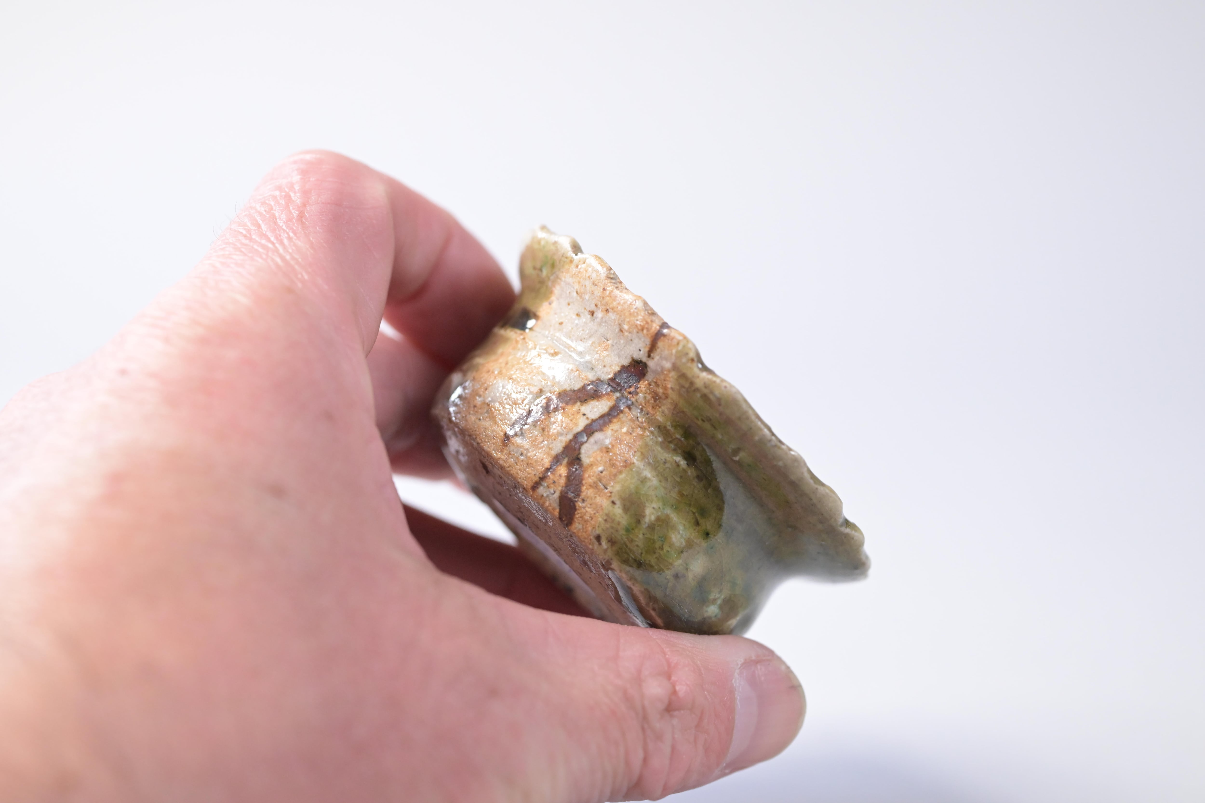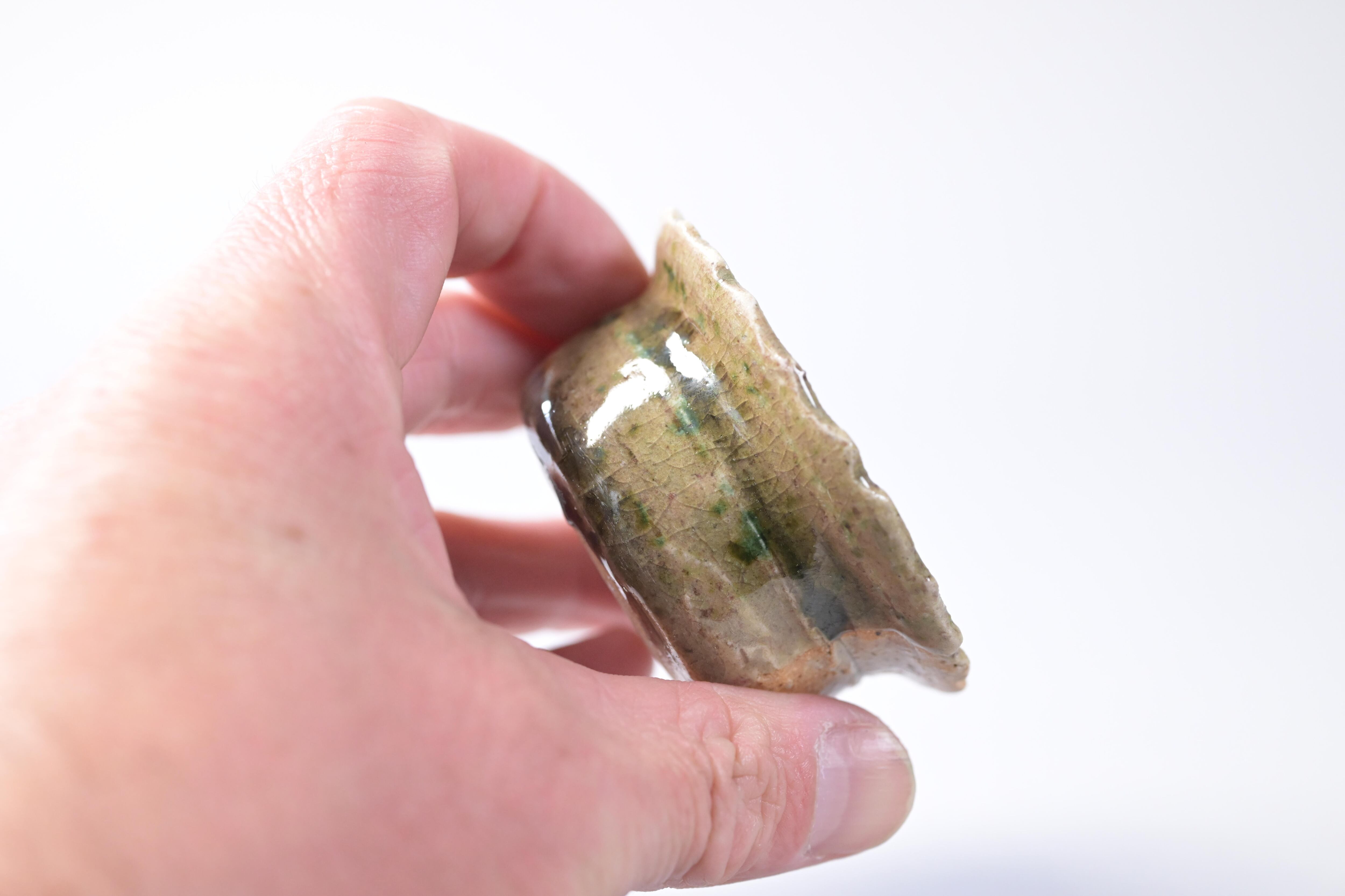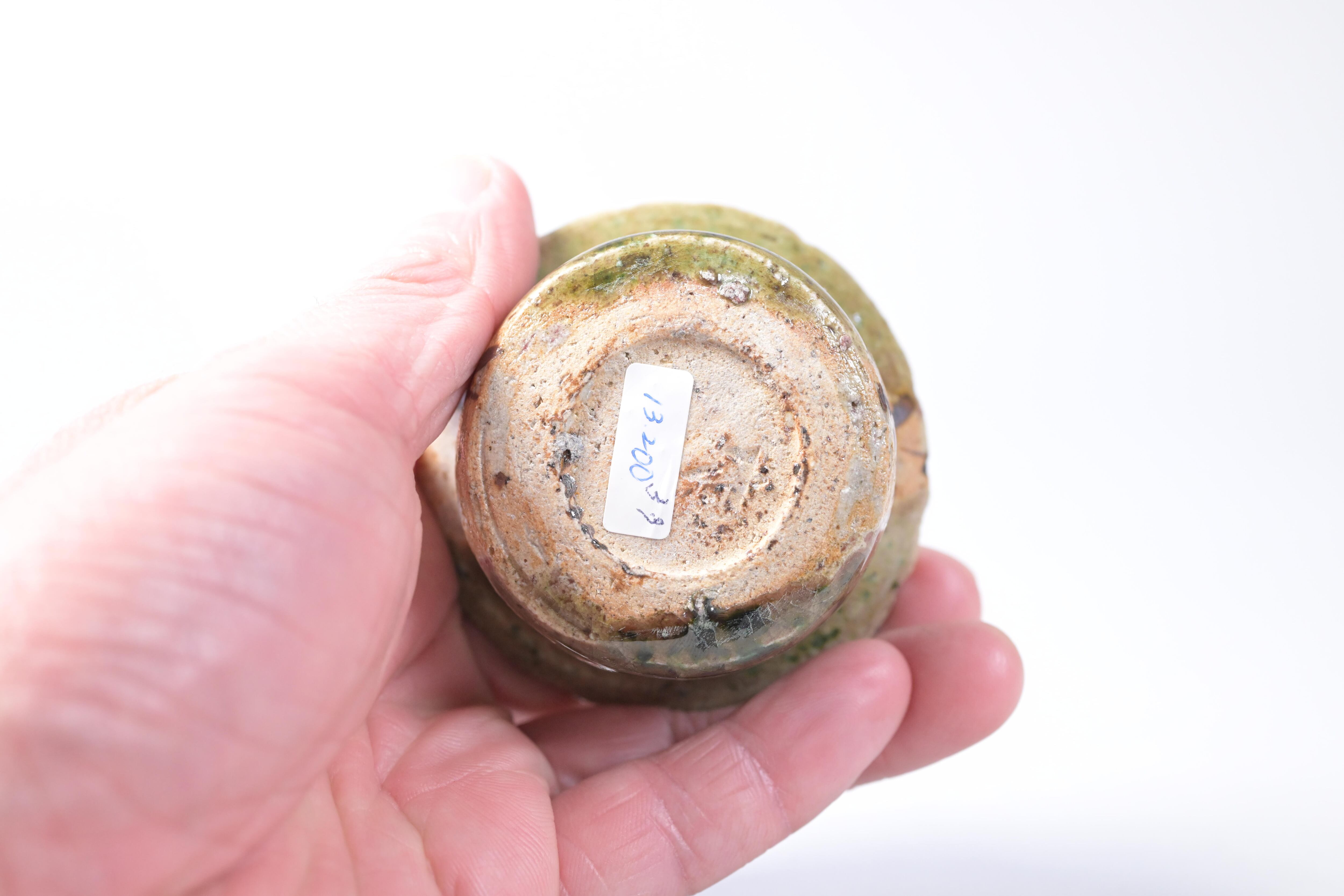土味を残した素地に、織部釉が静かに流れ、
