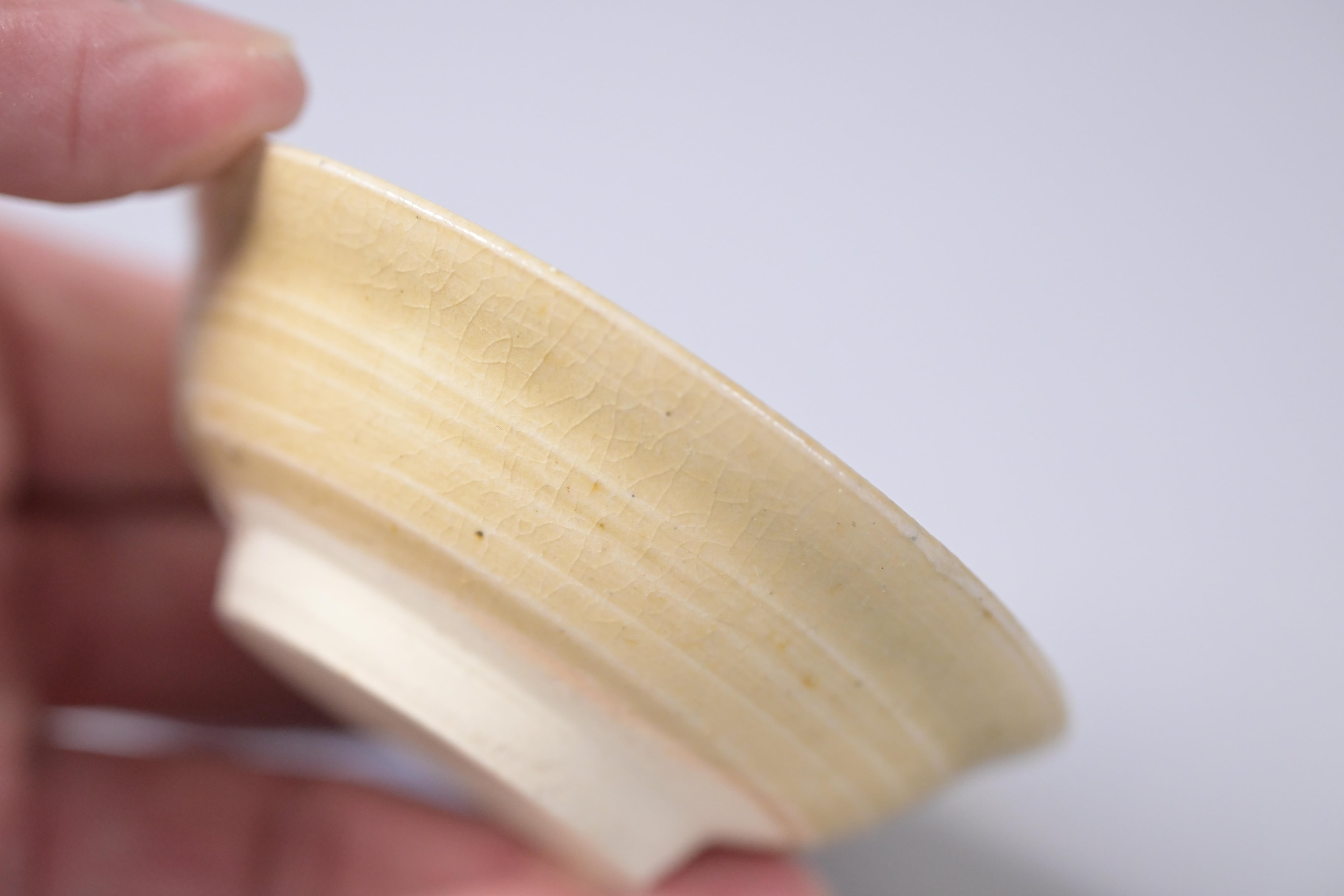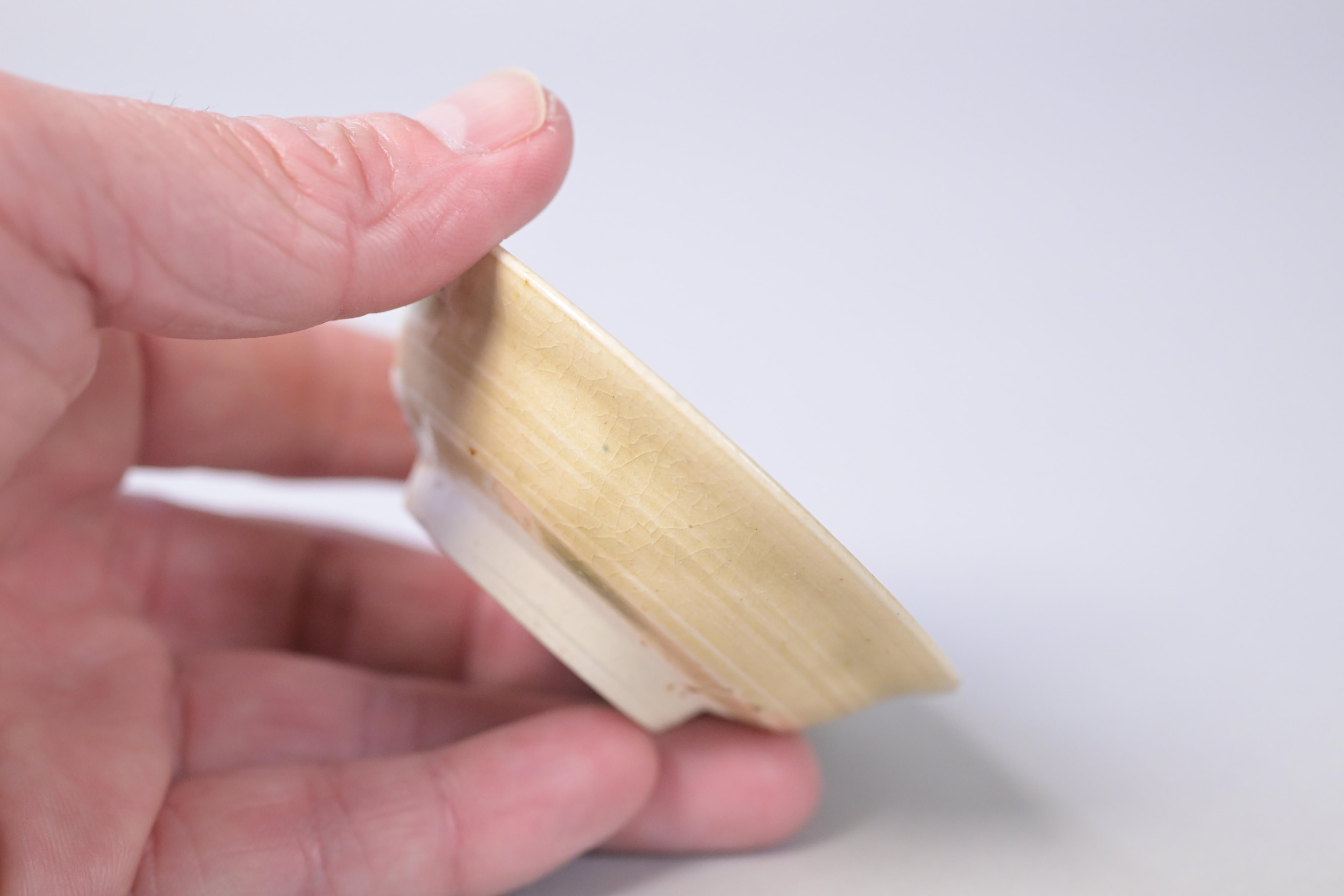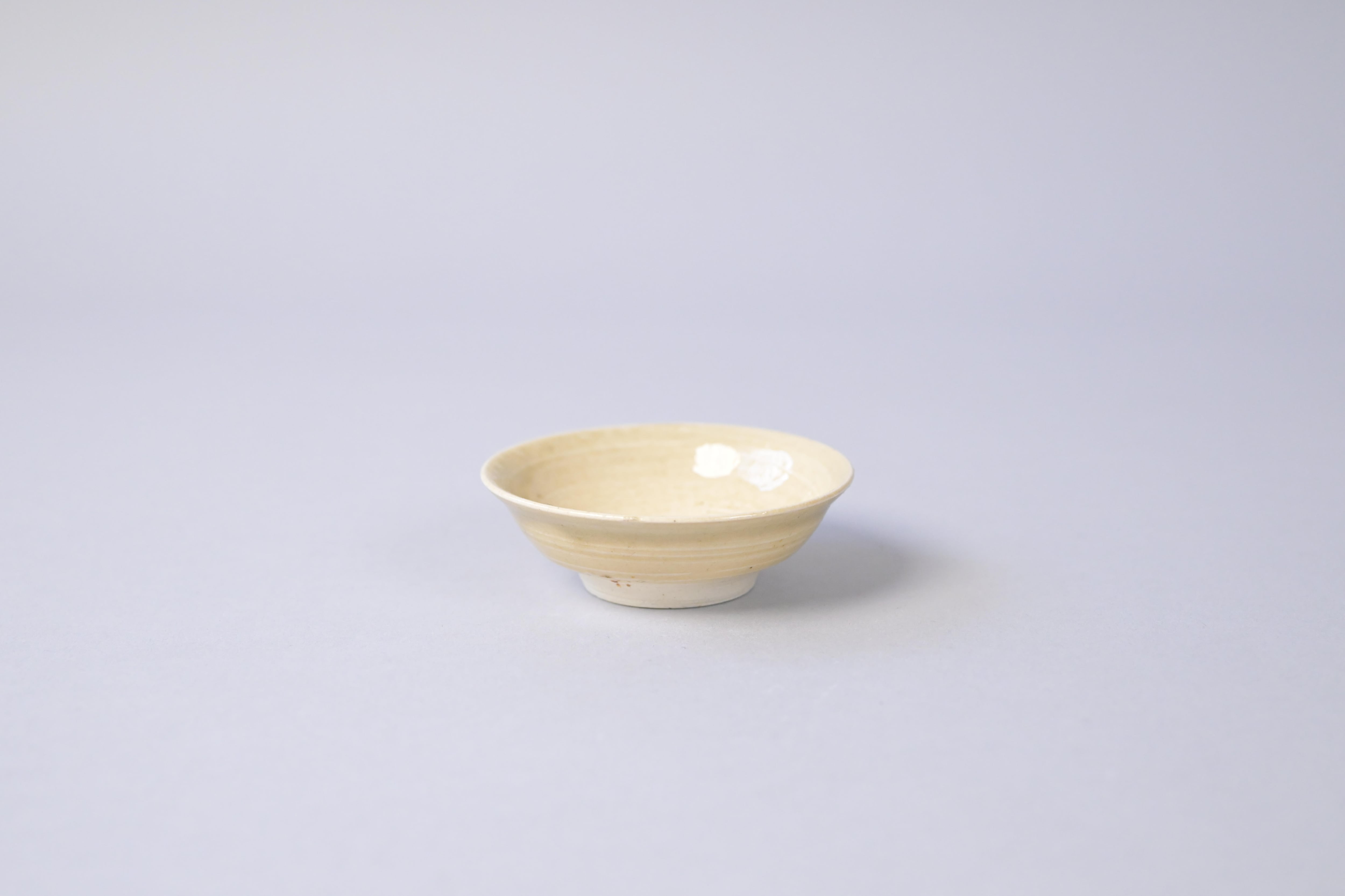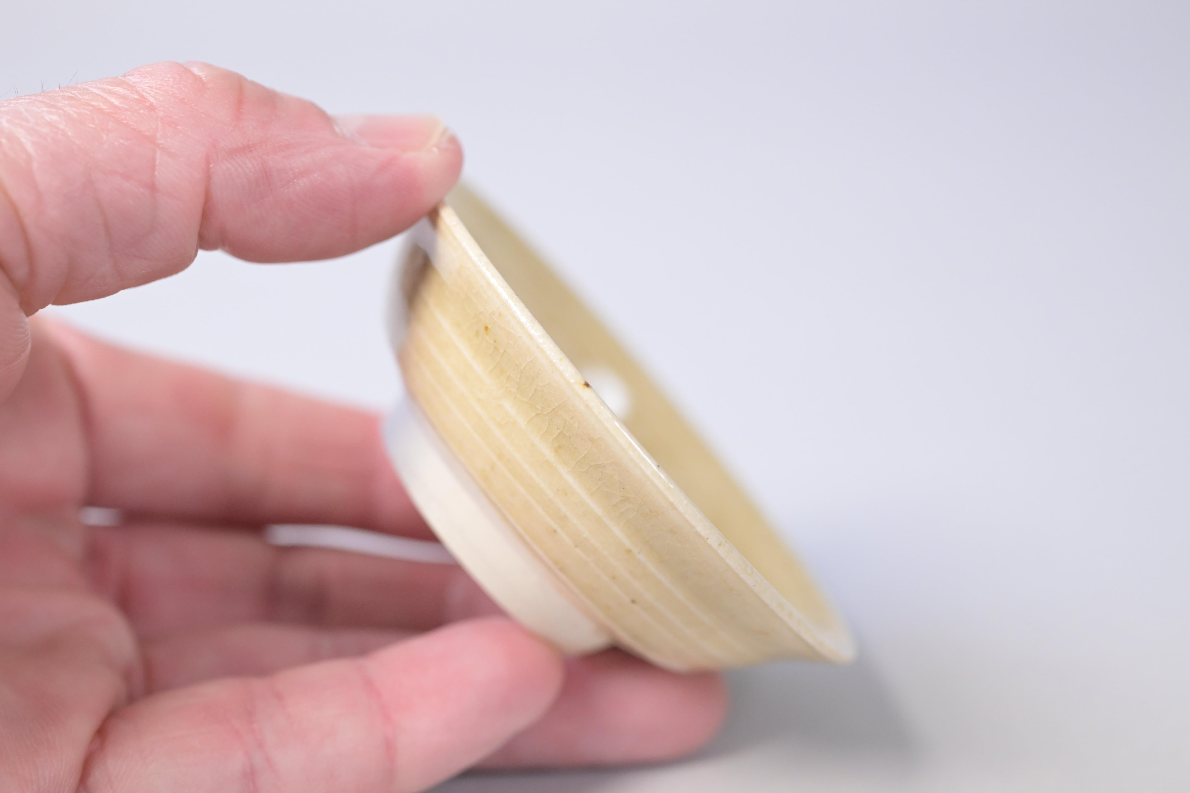柔らかな黄味を帯びた釉調に、ろくろ目が静かに残る山茶碗の盃。